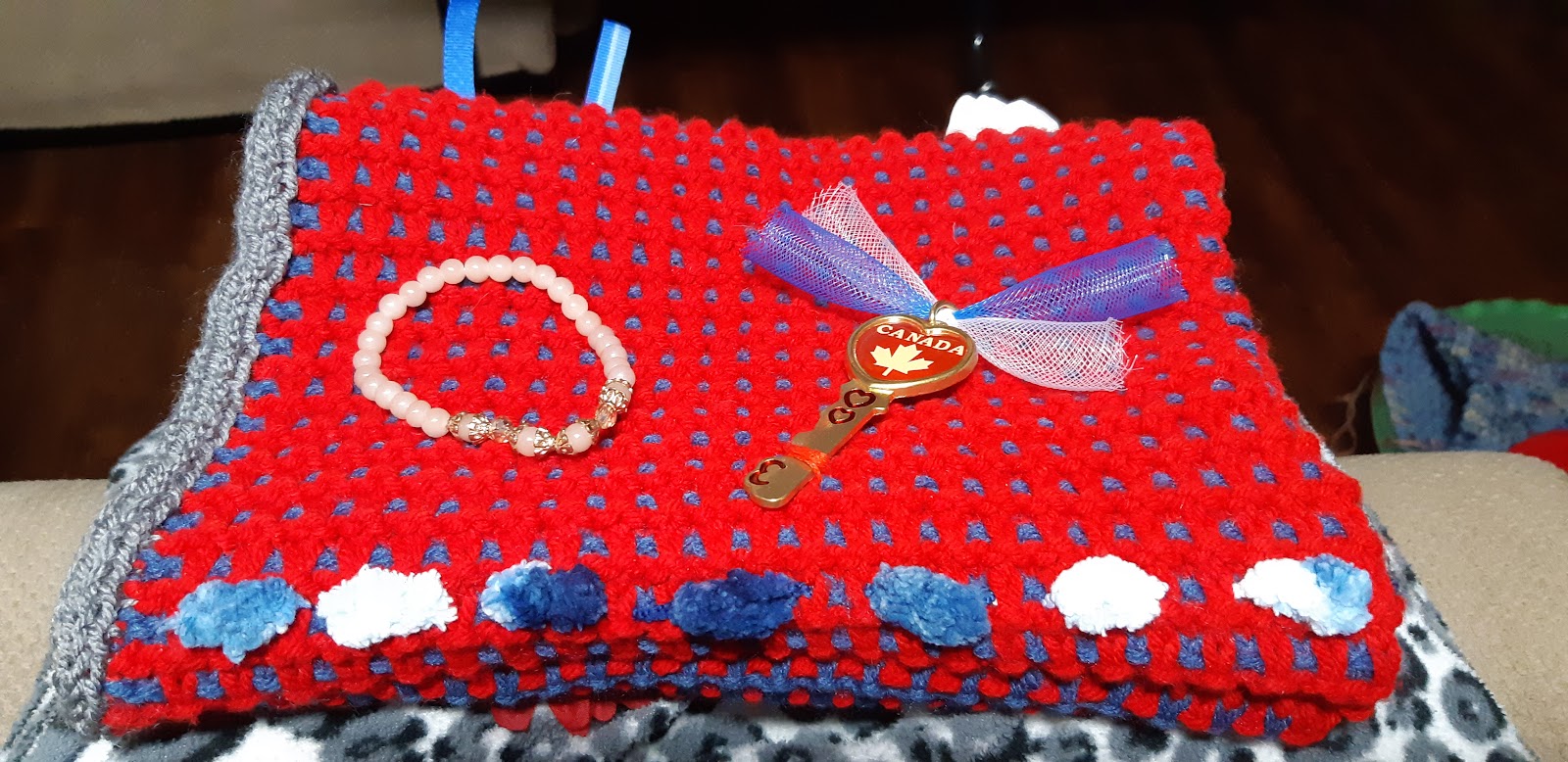 Auntie Colleen is decorating Twiddle Muffs for the hospital. I knit them, but decorating them is challenging and time-consuming...and the pics I am posting below will demonstrate what a fantastic job my artistic younger sister does of a task that I find tedious and frustrating! Look....
